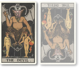 | 正位置 | 欲望、恐怖心、依存、ネガティブ思考、鬱、絶望感、怠惰、不倫、ギャンブル依存、アルコール中毒、薬物中毒、悪縁、悪い沼にはまる、執着、嫉妬、束縛、ストーカー、ゴミ屋敷、不潔、暴力、DV、抑えられない性衝動、ネガティブな人間関係、奴隷 |