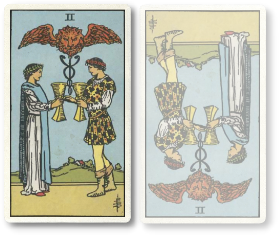 カップの2の正位置は、恋愛や友情やビジネスといった様々な関係性における幸せな結びつきを表します。気持ちのキャッチボールが十分に行われており、強い信頼関係で結ばれています。お互いが気持ちの深いところで繋がっていると感じている状態です。相手を理解し、また自分も理解されているという感覚に包まれており、両者ともに幸せそうで良好な関係が築かれています。