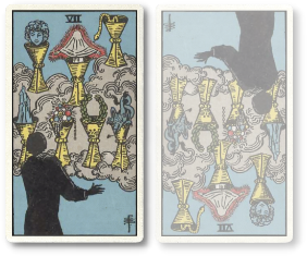 カップの7の正位置は、想像を膨らませて頭の中だけであれこれ悩んでいる状態を表します。選択肢が多すぎたり、ありもしないことを考えすぎて頭が混乱しています。あるいは、非現実的な世界に逃げている可能性もあります。