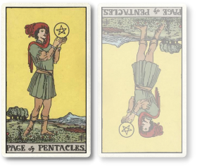 ペンタクルのペイジが逆位置になると、停滞したりなかなか進歩しない状況を表します。やらなければいけないとわかっていても何もしなかったり、怠けてしまって時間ばかりが無駄に過ぎていくことになります。あるいは、ものごとに対する理解が表面的で、努力の仕方が間違っている可能性もあります。