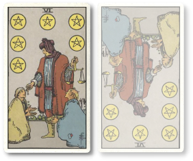 ペンタクルの6が逆位置になると、自分の持っている価値あるものの共有を拒んだり、与えない状態を表します。あるいは正当なものを受け取れていない状態かもしれません。労働に対して不当な対価しか与えなかったり、支配的になりすぎたり、何らかのパワーバランスが崩れている可能性があります。