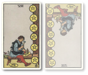 | 逆位置 | 楽をしたい気持ち、手抜き、うんざり、同じことの繰り返し、クオリティが悪い、怠ける、いい加減、集中力がない、気が散漫になる、スキルを活かせない、関わりが少ない、お金さえもらえればいい、失業 |