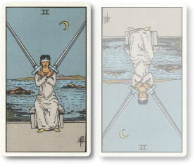 ソードの2が逆位置になると、膠着状態が終わり、ものごとが動き出したり変化があることを表します。抑圧していた感情が浮かび上がり、それと向き合うことになるかもしれません。自分の本当の気持ちを知ることで、今まで避けていた選択や決断をすることができるようになります。