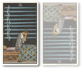 ソードの9の正位置は、心配事や悩み事、あるいは自己嫌悪や後悔によって夜も眠れないほど苦悩している状態を表します。精神的にとても辛い状況ですが、絶望するほどの問題ではない可能性もあります。過敏になっているだけで、心配していることが現実に起こることはなく杞憂に終わるものかもしれません。