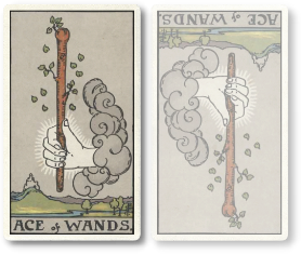 ワンドは火のエレメントなので、男性的で行動力があります。また1という数も男性的、行動的、始まりを意味します。ワンドのAは「心に火がついた」状態であり、そこからあらゆるものごとはスタートしていきます。時として、性的な意味での「火がつく」場合もあります。しかしこれも、生命の誕生には必要な情熱です。