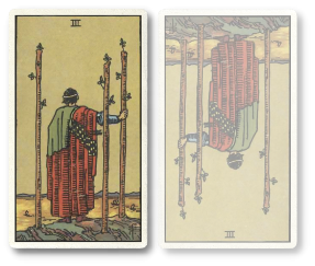 ワンドの3の正位置は、ものごとの第一段階が成功し、さらなる発展を目指している状態を表します。まだまだ満足できる状態ではなく、さらなる成長や発展に野心を燃やしています。それは、明るい未来を思い描ける状態であることを意味します。チャンスはたくさん訪れますので、後はチャンスを掴むために行動するのみとなります。
