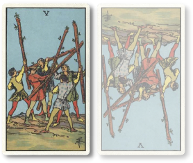 ワンドの5が逆位置になると、ネガティブな面が強調された争いを表します。例えば、言い争いやケンカがいつまで経っても収拾つかない状態になったり、根底に悪意があったりします。誰かに反対されたり足を引っ張られたら、それは悪意によるものかもしれません。建設的な議論や競争ではなく、相手を打ち負かそうとしている可能性があります。